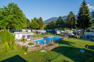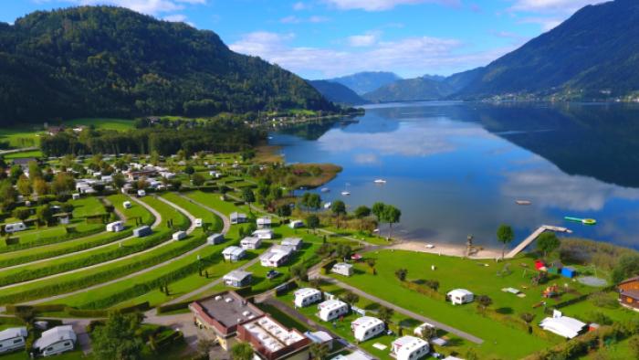 Anden campingplads Terrassen Camping Ossiach Komfortabel, rolig familiecampingplads med unik udsigt over søen og bjergene fra de terrasserede pladser. Pladser i første række - lige ved vandet!… Åben: april - oktober